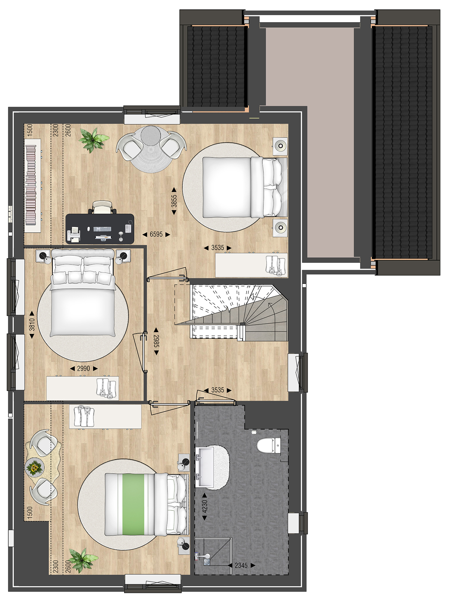 Rondom de woning ligt een riante tuin, zorgvuldig ontworpen met oog voor zowel esthetiek als privacy. Aan de voorzijde zorgen lage, sierlijke hagen voor een vriendelijke en uitnodigende uitstraling, terwijl aan de zij- en achterkant hoge hagen een natuurlijke afscheiding creëren. Hierdoor ontstaat een geborgen buitenruimte waar u in alle rust kunt genieten. De achtertuinen van deze villa’s zijn uitzonderlijk royaal, en bouwnummer 1 heeft als extra troef een prachtige ligging direct aan het water – een idyllisch decor voor lange zomeravonden of een kop koffie in de ochtendzon.